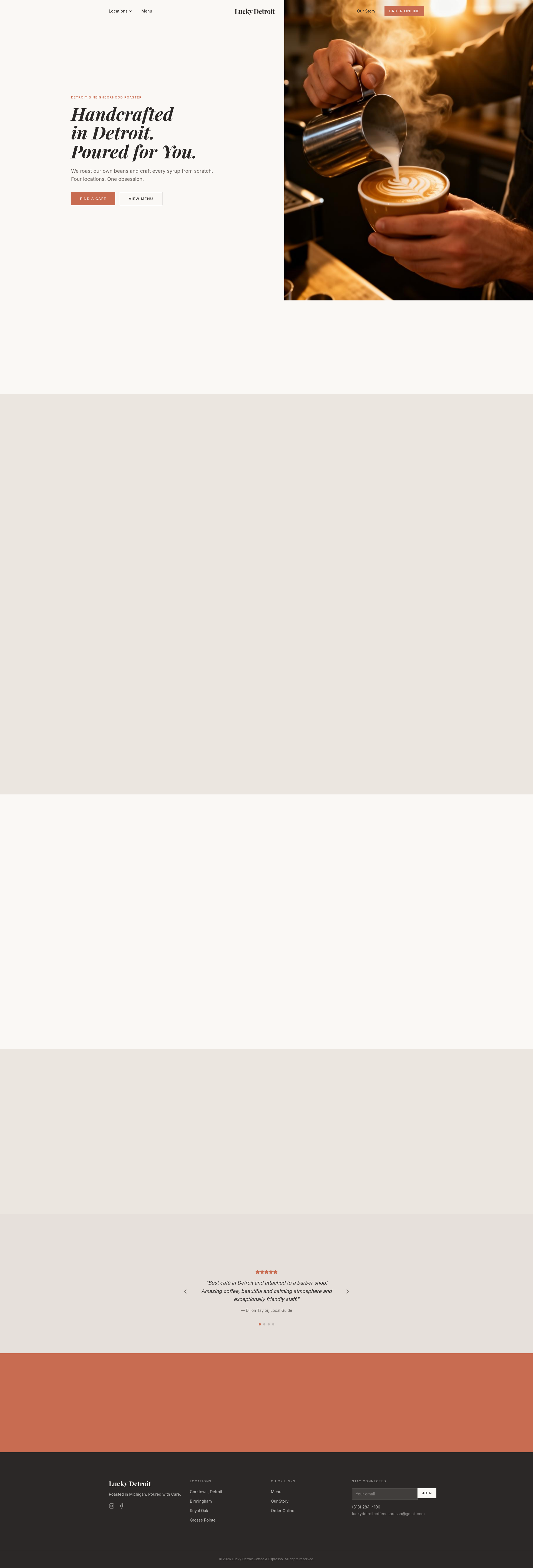 Metro Detroit's premier independent coffee roaster. Handcrafted espresso, house-made syrups, and locally roasted beans in Birmingham, Royal Oak, Corktown, and Grosse Pointe.